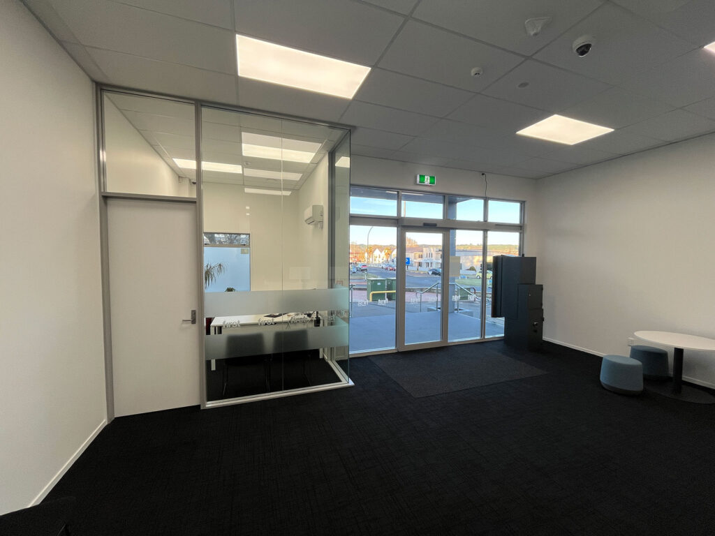 The interior works featured the installation of new partition walls, a compliant firewall, and a two-way suspended ceiling, complemented by custom office and kitchen cabinetry and fresh commercial flooring.